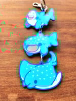 Show off your love for sharks and rays with this adorable keychain. This keychain features three 3D printed fish, including a bull shark, a whale shark, and a manta ray.